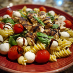 Chicken Caprese Pasta Salad brings together Italian caprese flavor with hearty pasta and tender chicken. Juicy tomato, creamy mozzarella, fragrant basil, and a light balsamic touch create a refreshing dish that feels both satisfying and bright.