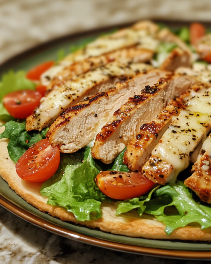 PrintCrispy flatbread layered with juicy seasoned chicken, melted cheese, and fresh Caesar salad topping for a delicious and easy meal.