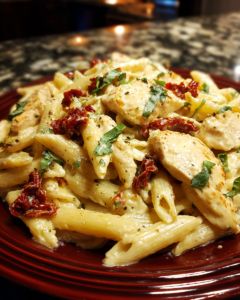 Several fresh herbs complement the flavors in this salad. Basil pairs especially well with sun-dried tomatoes and creamy Parmesan dressing. Parsley offers a clean, fresh flavor that brightens the dish. Chives introduce a gentle onion note without overpowering the chicken. A small handful of chopped herbs sprinkled just before serving adds aroma and visual appeal while keeping the flavor balanced.