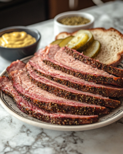 Unlike standard smoked brisket, this preparation emphasizes curing spices and that unmistakable peppery exterior. The result is savory, aromatic, and deeply satisfying.