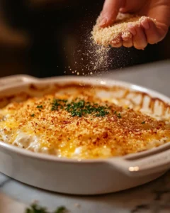 Place the baking dish in the preheated oven and bake for 20–25 minutes, or until the top is golden and bubbly and the seafood is cooked through. Cooking times may vary slightly depending on the size of your seafood pieces, so check that shrimp are pink and opaque, scallops are firm, and the fish flakes easily with a fork. During baking, the sauce will thicken further, and the topping will crisp, creating a luxurious contrast of creamy interior and crunchy top layer.
