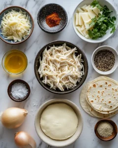 Next, prepare the filling. In a large mixing bowl, add the shredded cooked chicken, shredded cheese, and softened cream cheese. The cream cheese should be soft enough to blend smoothly; if it’s too cold, microwave it for 10–15 seconds. Add the finely chopped onion, garlic powder, smoked paprika, cumin, salt, and black pepper. Using a spoon or spatula, mix everything together until fully combined. The mixture should be creamy, well-seasoned, and evenly distributed, with no large clumps of cream cheese. Take a moment to taste the filling and adjust seasoning if needed—this is your chance to add more salt, spice, or smokiness to suit your preferences.