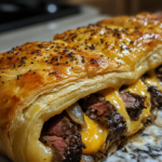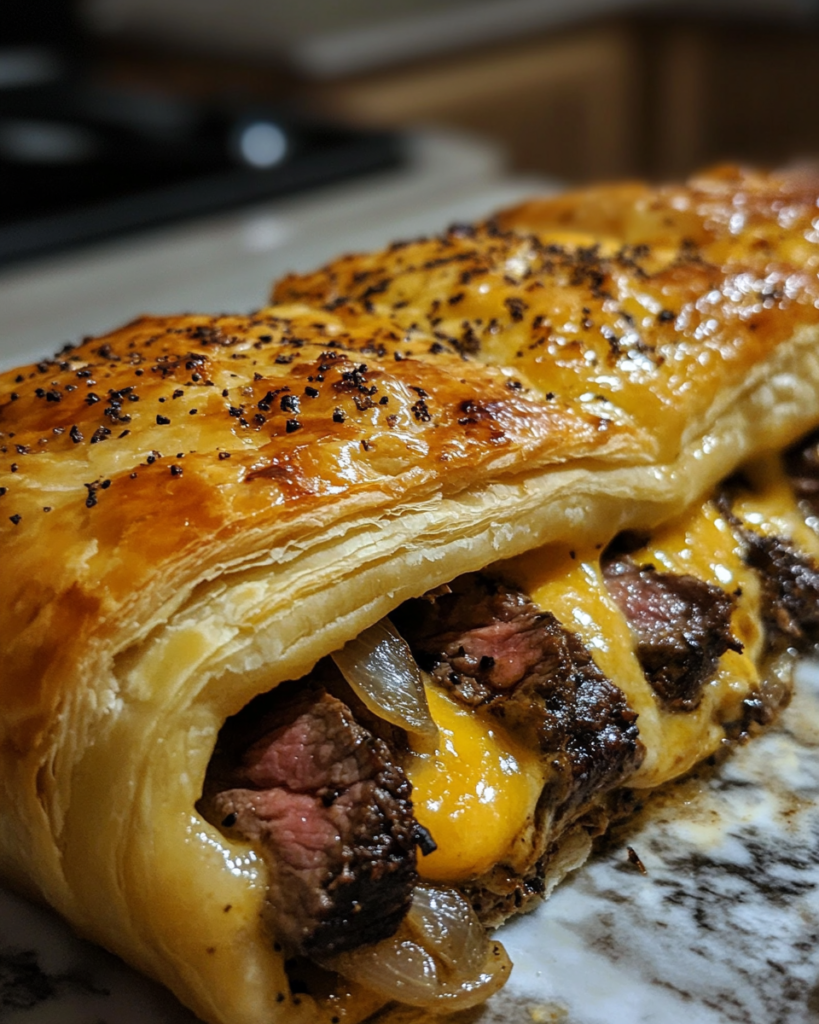 PrintA flaky puff pastry roll filled with tender steak and melted cheese, baked to golden perfection for a comforting bakery-style meal.